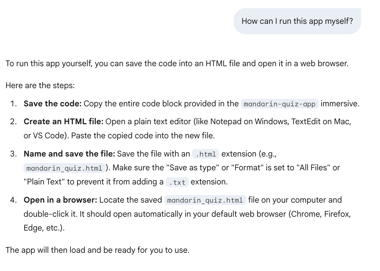 Gemini essentially repeated the requirements back to me and then said it would generate the code. Once it was ready, it ran me through how to use the app as a user, but it did not tell me how to run the app so I asked.