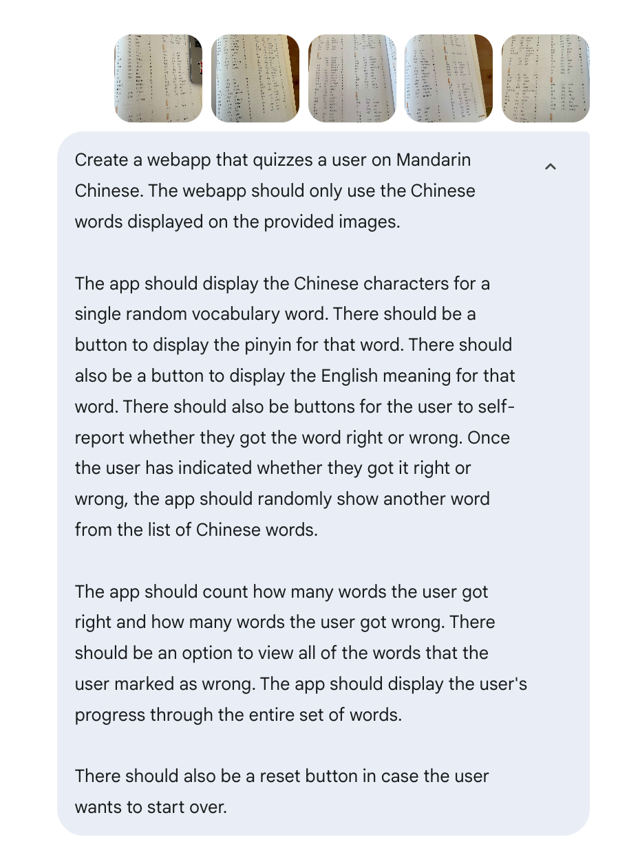 Second, I decided that I would take photos of my Chinese workbook and use that to seed the list of words rather than leaving it up to Gemini to decide what words to use.